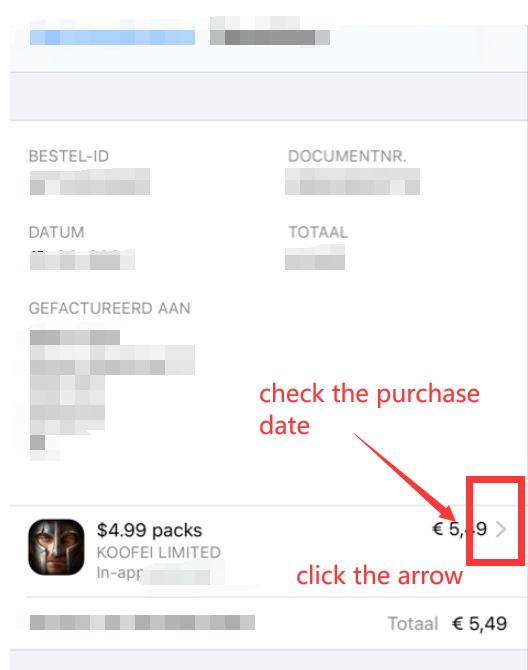 3. Please log in to your iTunesaccount to view the purchase history, and tap the arrow on the order to viewthe purchase time instead of the payment time. Here is the link on how to viewthe purchase history of iTunes or Apple account: https://support.apple.com/en-hk/HT204088